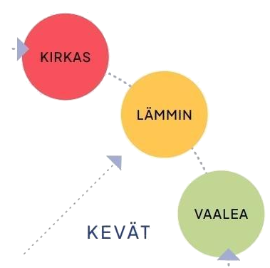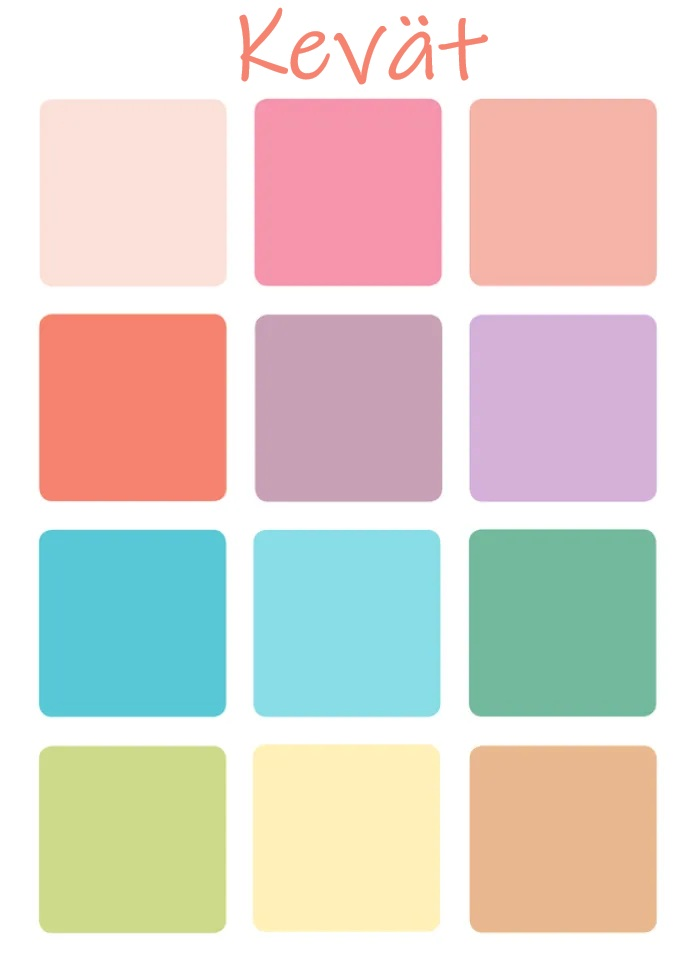 Moodcolors-järjestelmässä on 12 tarkkaa vuodenaikakategoriaa: esimerkiksi kirkas kevät, pehmeä syksy. Ne kertovat, mitkä värit tukevat sinua parhaiten, ja millaisessa sävymaailmassa todella säteilet.