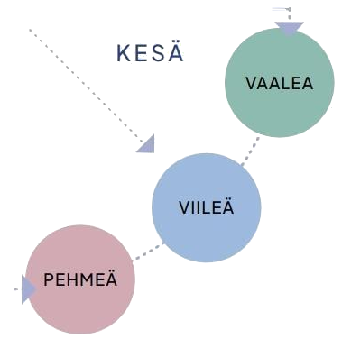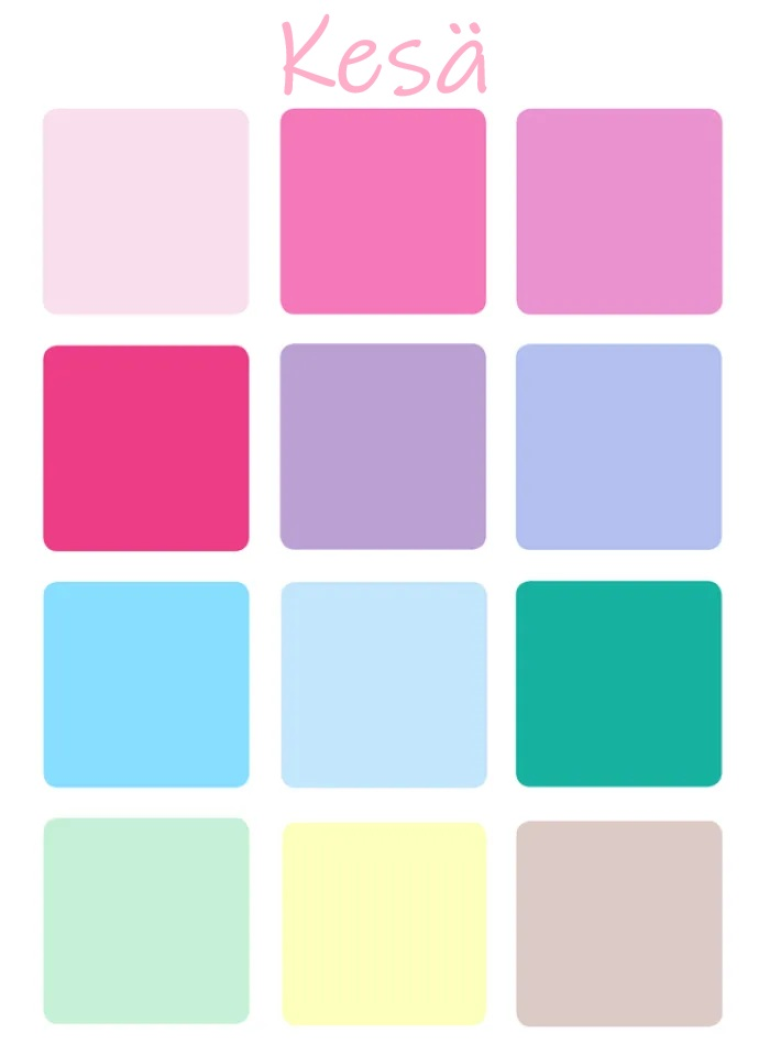 Kesän värivuodenaika viittaa viileisiin, pehmeisiin ja hillittyihin sävyihin, joissa ei ole voimakasta lämpöä tai kirkkautta. Värit ovat tummemman vaaleita, mutta eivät synkkiä. Ne muistuttavat sumuista aamua, kevyttä kesätuulta ja hämärtyvää iltapäivää.Värit ovat viileitä, pehmeitä ja rauhallisia. Ei kirkasta väriä, vaan harmautta ja vaaleita sävyjä, jotka antavat kokonaisuudelle seesteisen ja hienovaraisen vaikutelman.Parhaat metallisävyt kesälle ovat hopea ja valkokulta. Näitä voi käyttää asusteissa ja koruissa, jotka korostavat viileää ja puhdasta ilmettä.