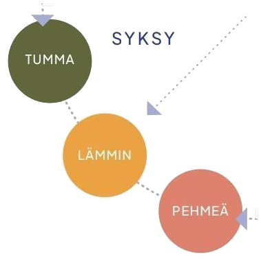 Syksyn värivuodenaika on täynnä lämminhenkisiä, sydämellisiä ja miellyttäviä värejä. Syksy on mausteinen ja rikkaita sävyjä tarjoava vuodenaika, jossa värit muistuttavat kypsyneitä hedelmiä, sateisia iltoja ja ruskan väriloistoa. Syksyssä on tunnelmaa ja syvyyttä.